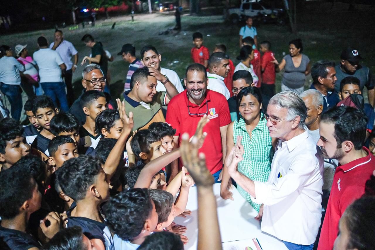 En medio de un ambiente de alegría, animado por niños de la Escuela de Fútbol Álex Acosta y Fernel Díaz, el gobernador Verano destacó las ventajas del megaproyecto en la tradicional cancha de arena en la que se han formado deportistas locales, especialmente en fútbol.