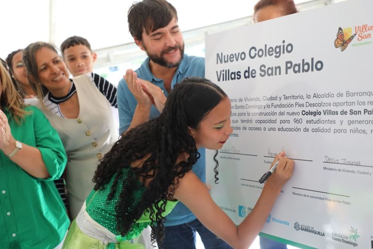La gran noticia fue oficializada este sábado en un encuentro que sostuvo el alcalde de la ciudad, Jaime Pumarejo Heins; la ministra de Vivienda, Ciudad y Territorio, Catalina Velasco; el director ejecutivo de la Fundación Santo Domingo, José Aguirre, y representantes de la Fundación Pies Descalzos con líderes de la comunidad, estudiantes, familias y aliados para realizar la firma del convenio que anuncia que el proyecto de construcción de un nuevo colegio ya es una realidad.