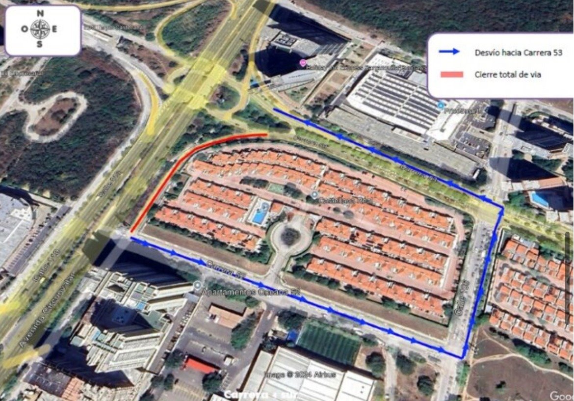 El tránsito vehicular que normalmente se dirige hacia la carrera 53 podrá realizar un desvío tomando la carrera 52, para continuar hacia la calle 106 y luego girar hacia la carrera 53 y reincorporarse a su recorrido habitual.
